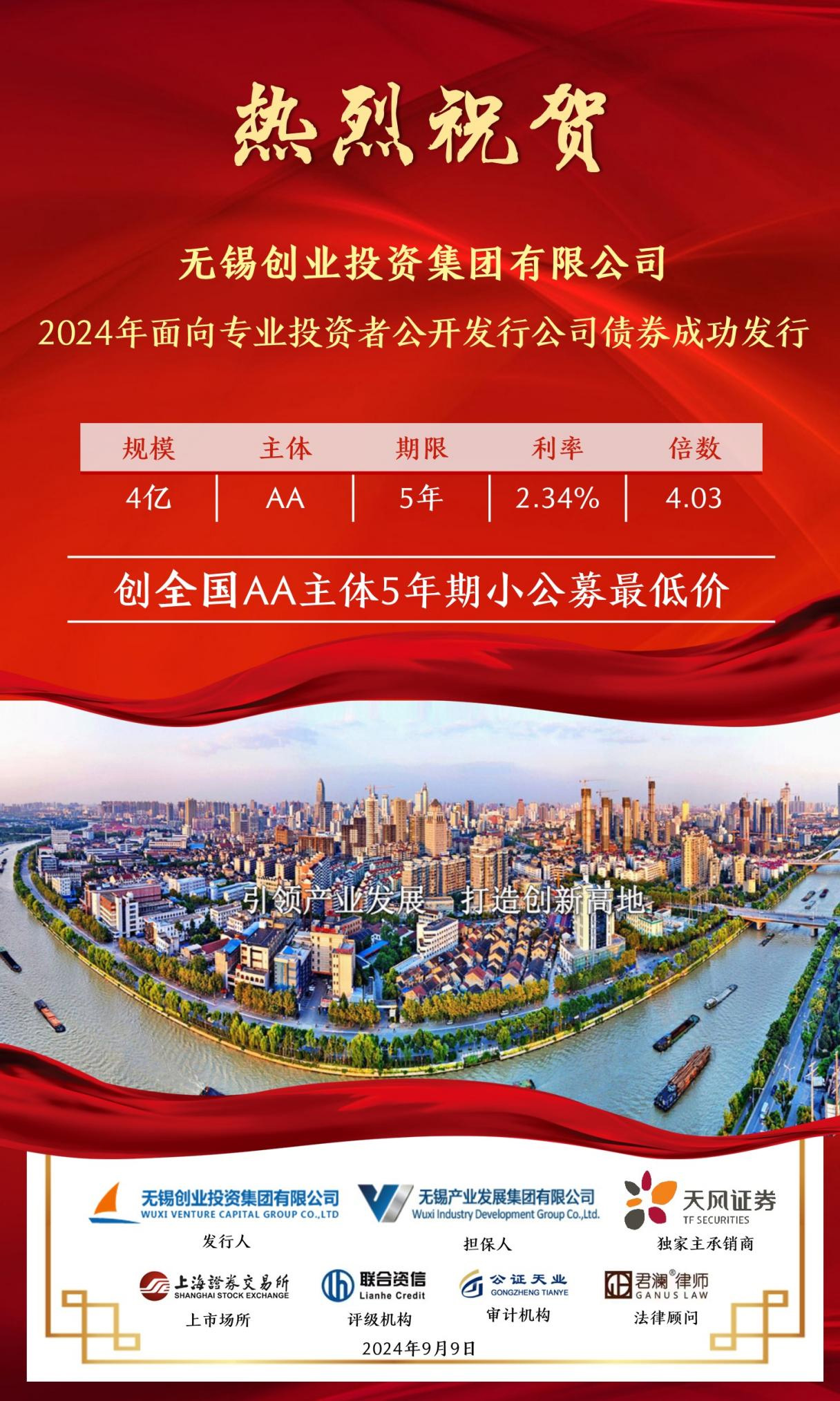 9月9日,無(wú)錫創(chuàng)業(yè)投資集團(tuán)有限公司(簡(jiǎn)稱“無(wú)錫創(chuàng)投集團(tuán)”)2024年面向?qū)I(yè)投資者公開發(fā)行公司債券“24錫創(chuàng)01”成功發(fā)行,發(fā)行規(guī)模4億元,發(fā)行期限5年,認(rèn)購(gòu)倍數(shù)4.03倍,票面利率2.34%,創(chuàng)全國(guó)可比債券歷史發(fā)行最低利率!本期債券由天風(fēng)證券承銷,主體評(píng)級(jí)AA,債項(xiàng)評(píng)級(jí)AAA。 無(wú)錫創(chuàng)投集團(tuán)作為無(wú)錫產(chǎn)業(yè)集團(tuán)旗下的創(chuàng)業(yè)投資和股權(quán)投資平臺(tái),近年來(lái)在集團(tuán)的正確領(lǐng)導(dǎo)和大力支持下,圍繞無(wú)錫“465”現(xiàn)代化產(chǎn)業(yè)集群建設(shè),聚焦產(chǎn)業(yè)集團(tuán)“1+4+X”產(chǎn)業(yè)布局,持續(xù)深化產(chǎn)融協(xié)同合作,不斷提升資金使用效率,努力為公司高質(zhì)量發(fā)展提供更低成本、更長(zhǎng)周期、更加靈活的資金支持。未來(lái),公司將繼續(xù)承擔(dān)國(guó)企社會(huì)責(zé)任,勇挑重?fù)?dān),發(fā)揮自身優(yōu)勢(shì),持續(xù)為無(wú)錫新質(zhì)生產(chǎn)力和實(shí)體經(jīng)濟(jì)高質(zhì)量發(fā)展注入新活力、增添新動(dòng)能。 |